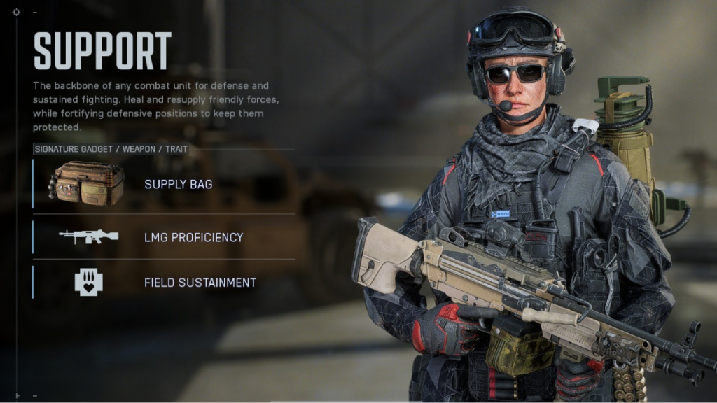 Combat Medic: Takımınızın en önemli sınıfı olan Support’lar, sizlere can vermek ve düştüğünüzde sizi kaldırmak için canla başla çalışır. En öne çıkan özelliği, yere düşen takım arkadaşlarını saniyeler içerisinde geri kaldırabilmesidir. Buna ek olarak sunduğu sağlık çantası ile takımına her daim destek olur. Genellikle LMG sınıfı silahlar veya yakın mesafeli silahlar tercih ederler.