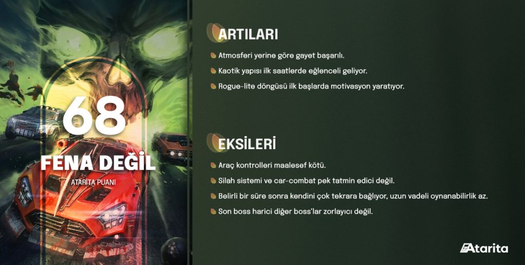 İncelemeyi olabildiğince kısa tutmak istiyorum. Rogue Shift’in Carmageddon serisiyle neredeyse hiçbir alakası yok. İyi de bir Rogue-lite oyunu sayılmaz. Ancak kendince yapmak istediği bazı güzel şeyleri var, atmosferi gibi. Sunmaya çalıştığı şeyi anlıyor ve bunu takdir ediyorum ancak sunum konusunda pek iyi olduğunu söyleyemem. 5-6 saatlik bir eğlence deneyimi sonrası tekrara düşmesi ve kendini yenileyememesi bu nedenlerden bir tanesi.