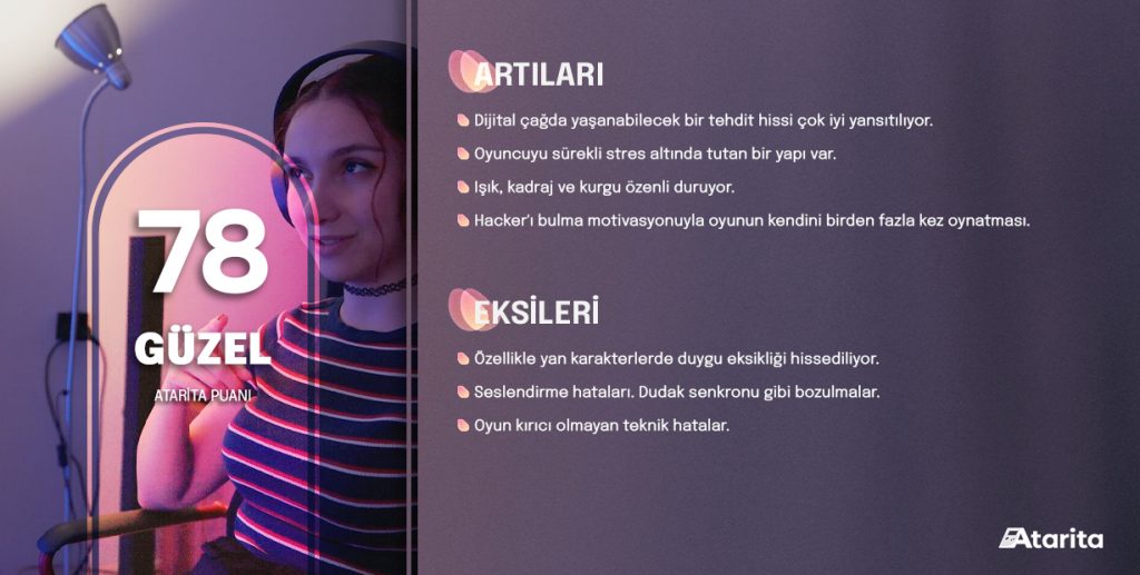 Bu paragrafta oyunun hikâyesine dair spoiler bulunmaktadır: Senaryosu beni yeterince tatmin etti. Yayıncı ve arkadaş çevresinin birbirine olan samimiyetinin bazı yolları açması ve hacker’ı bulma yolunda edindiğimiz ipuçları, oyundaki gerçek şantajcıyı ortaya çıkarma konusunda hedefi iyi şaşırtıyor. Mesela Deniz karakterinin bir bölümde bilgisayarınızın kontrolünü ele alıp size yardımcı olmak istemesi, onun aradığınız hacker olduğunu düşündürebiliyor. Yani oyuncuya sade bir senaryo dizaynı yerine şüphe uyandıran yollar sunulmuş ve bu kesinlikle olması gerektiği gibi işlenmiş. Bu tür ufak nüanslar, senaryonun derinliği açısından önemli.