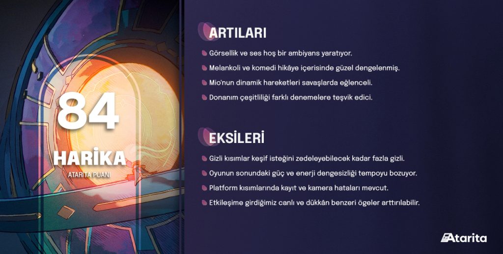 MIO: Memories In Orbit tecrübem bu şekildeydi. Oyunu kesinlikle beğendim. Birtakım dokunuşlardan sonra çok daha güzel olacağını düşünüyorum. Aklım gördüklerimde değil, göremediklerimde. Şakası bir yana, her ne kadar sinir ederse etsin kendini oynatan ve merak ettiren bir yapıya sahip.