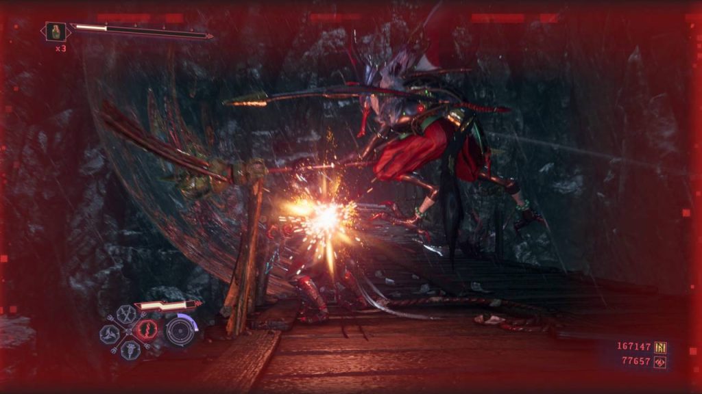 Öncelikle olarak oyunda parry sistemi mevcut. Doğru zamanda blok tuşuna basarsanız Yakumo parry yapabiliyor. Parry’den sonra da üçgen tuşuyla hızlı bir karşı saldırı yapabiliyorsunuz. Ben bu mekaniği oyun boyunca oldukça az kullandım. Zaten oldukça kaotik olan savaş ortamında düşmanın saldırılarını beklemek bana oyunu temposuna zarar veriyormuş gibi geldi. Fakat bir diğer ekledikleri mekanik olan son anda kaçınmayı oldukça kullandım. Elbette bir kaçınma tuşumuz var. Platinumun çok az bir süre dahi olsa bir ağır çekim fantezisi var.
