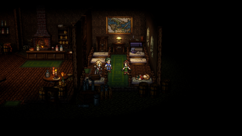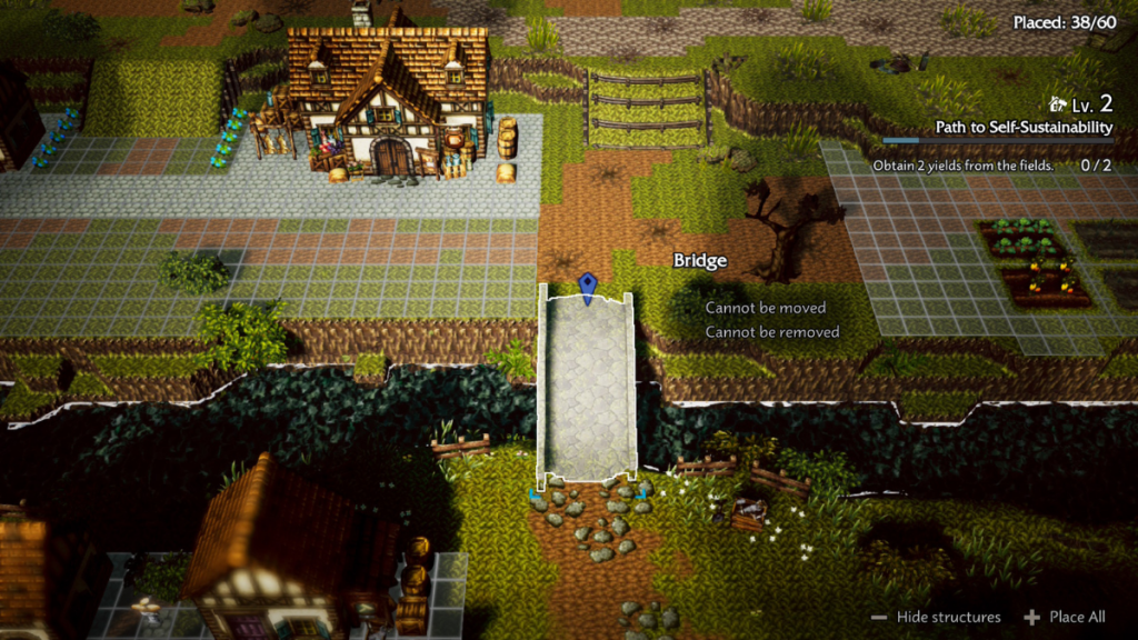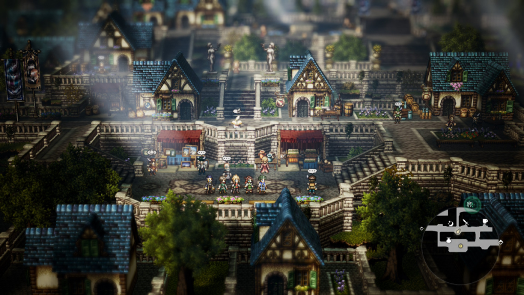 Octopath Traveler 0 yukarıda da bahsettiğim gibi kendi içinde bir şehircilik mini oyununa sahip. Köyü yeniden canlandırma işini sadece belli otomatik sahnelerle sabit tutmayıp, bayağı işleri oyuncunun zevkine bırakan, yeni tasarımlar, süslemeler ve binalara taşınabilirlik eklenmesi fikrini beğendim. Oyun buradan itibaren aman aman bir yaşam simülasyonuna dönüşmese de her yeni karakterin sunumu, savaşlarda yardımcı olacak eşyalar üretmeleri ve oynanışı kolaylaştırmaları adım adım işlenmekte.