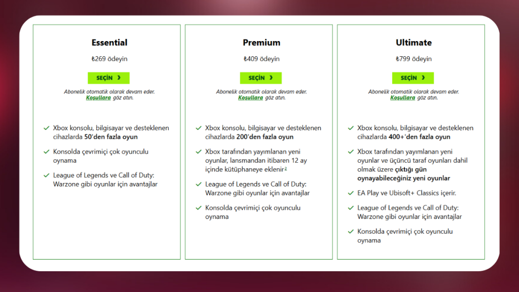 Ultimate | Bu paket, Game Pass’in tüm özelliklerini sonuna kadar kullanma imkanı verecek. Tüm Game Pass kütüphanesi, ilk günden eklenecek oyun lansmanları, Ubisoft + ve diğer ayrıcalıklar. Bu paket hem PC hem de konsollarda kullanılabilecek. |